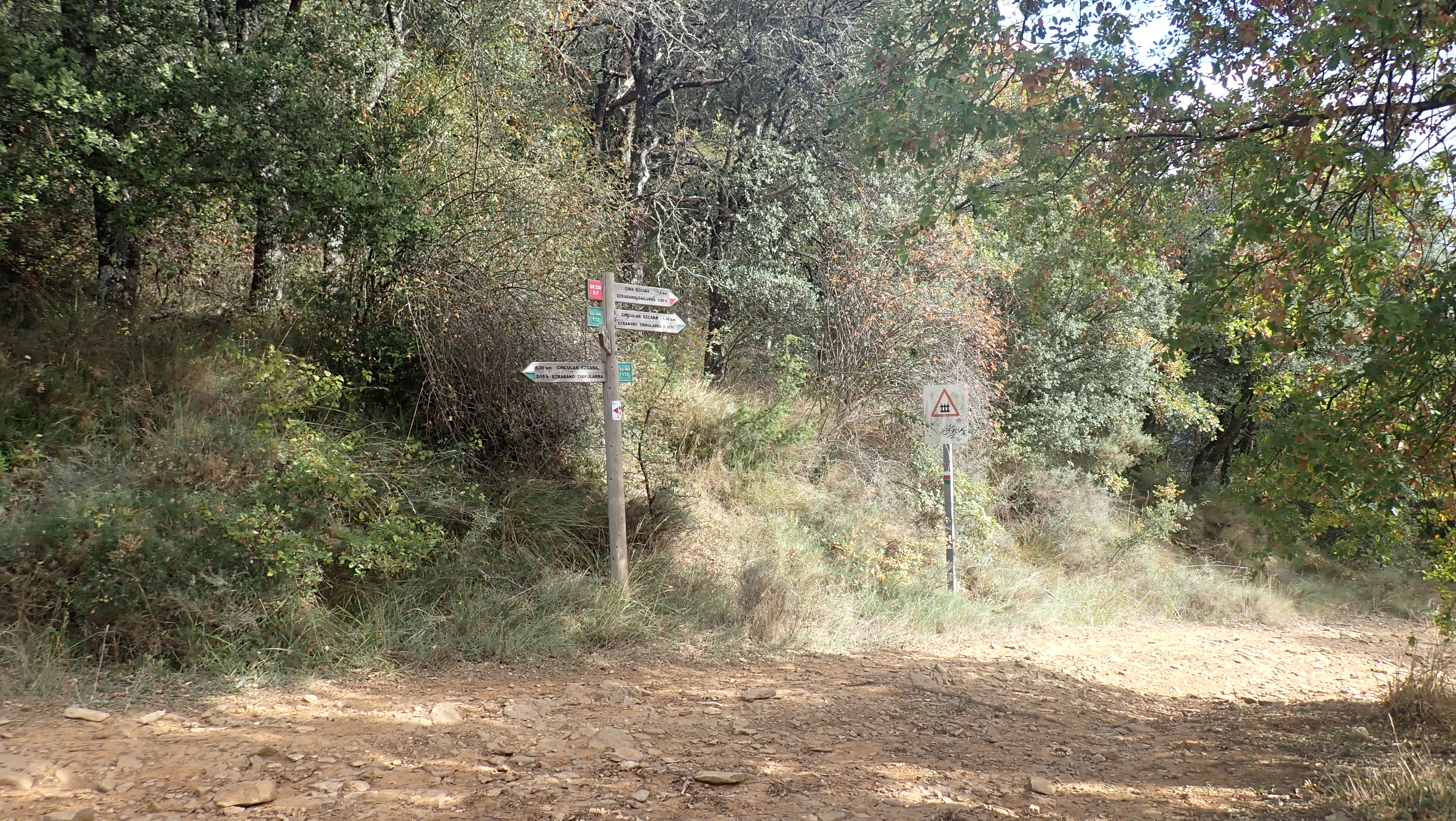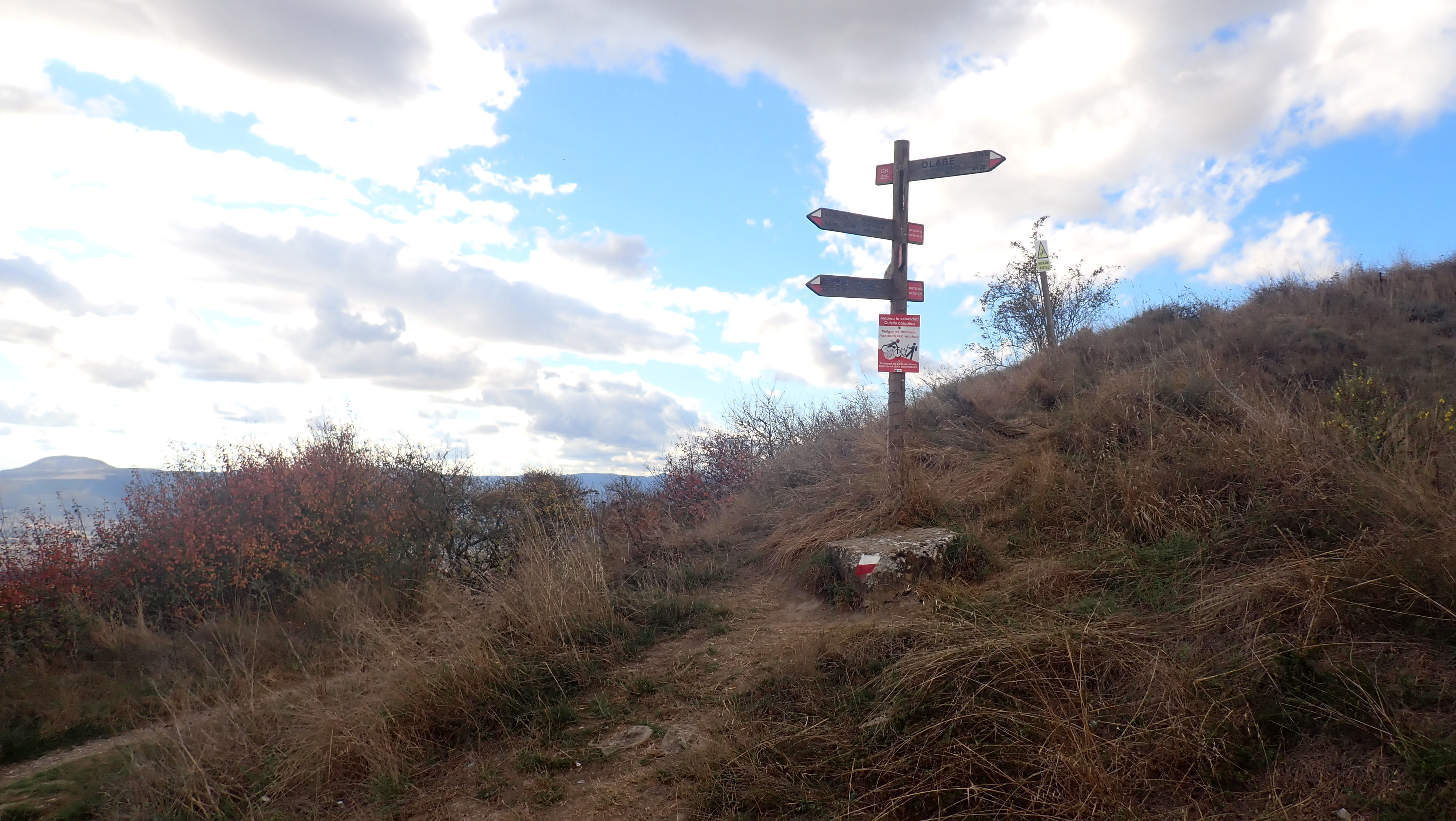 Giramos a la derecha y seguimos la dirección de la flecha del GR®220 D.8 cima Ezkaba. A los pocos minutos, en ascenso, llegamos al poste del Camino del Monte.